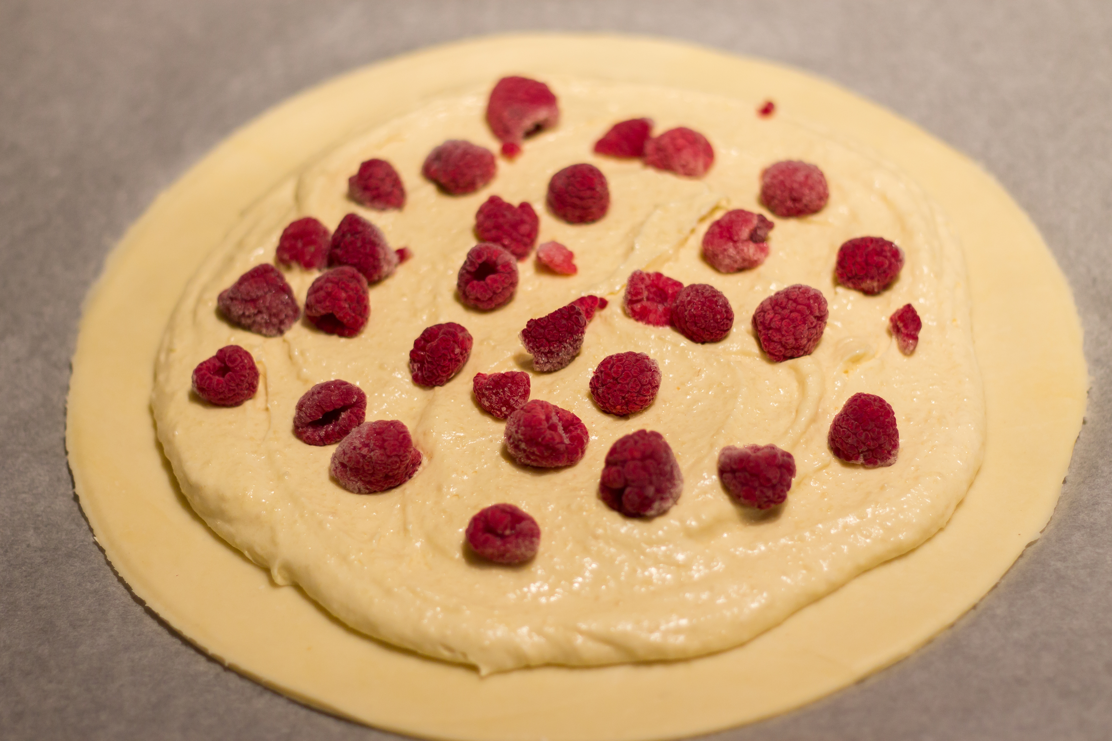 Verser le mélange sur la première pâte feuilletée (c’est à ce moment qu’il ne faut pas oublier la fève…) en laissant 2 cm au pourtour. Disposer les framboises.