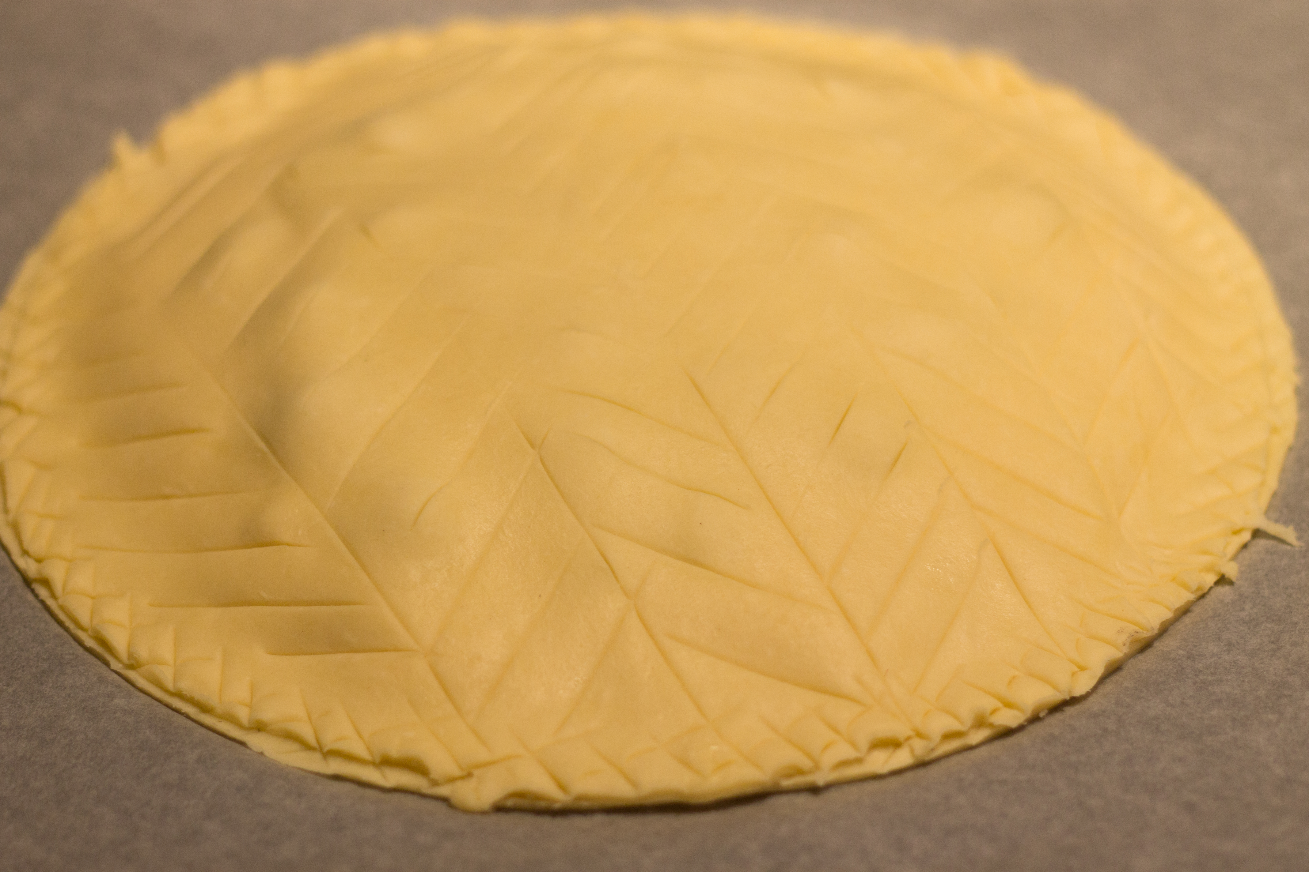 Avec la pointe d’un couteau, former des dessins au dessus et badigeonner d’un œuf battu.