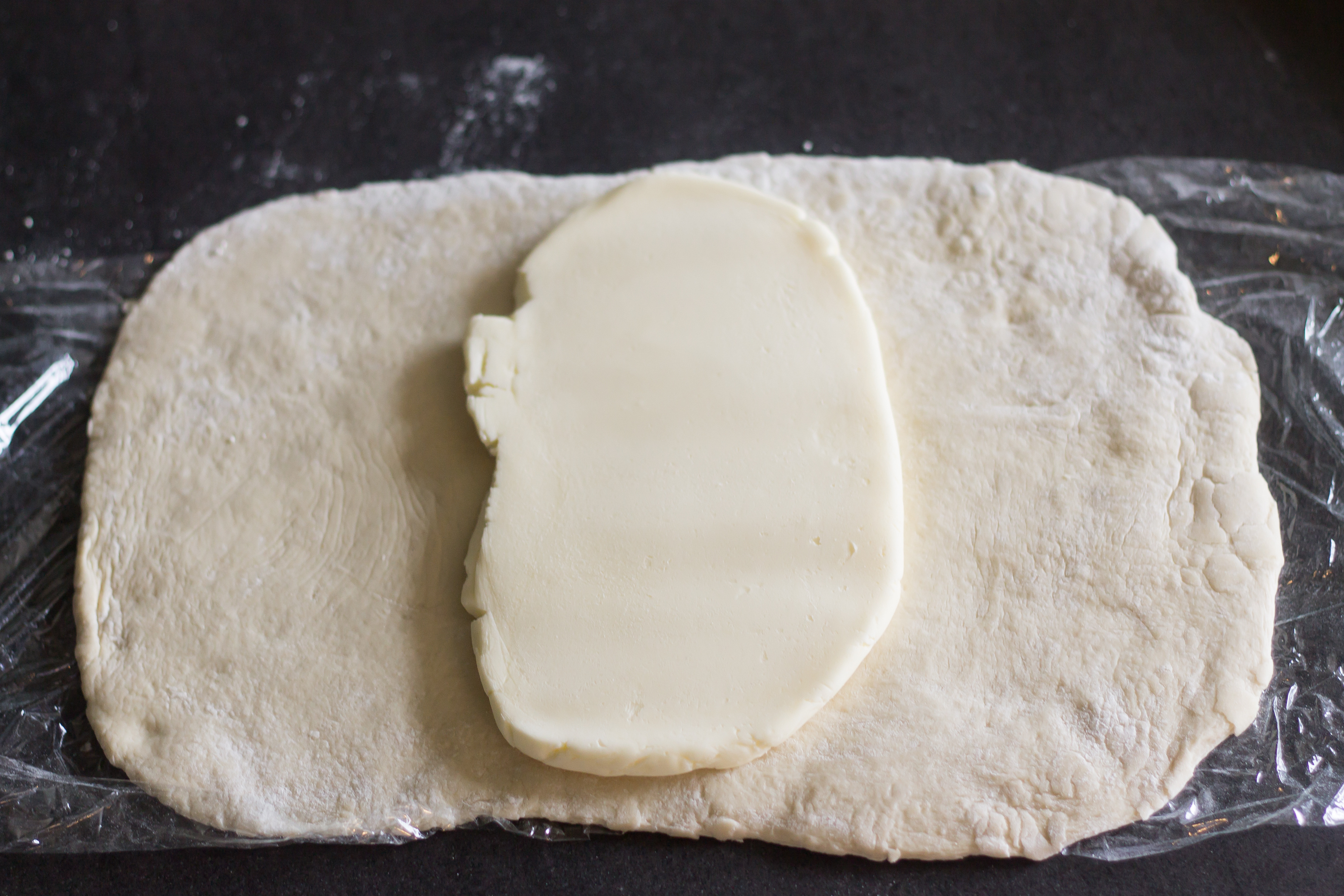 Aplatir le beurre dans du papier étirable (pour qu’il ne colle pas au rouleau) en rectangle d’1/3 de la surface de la pâte.