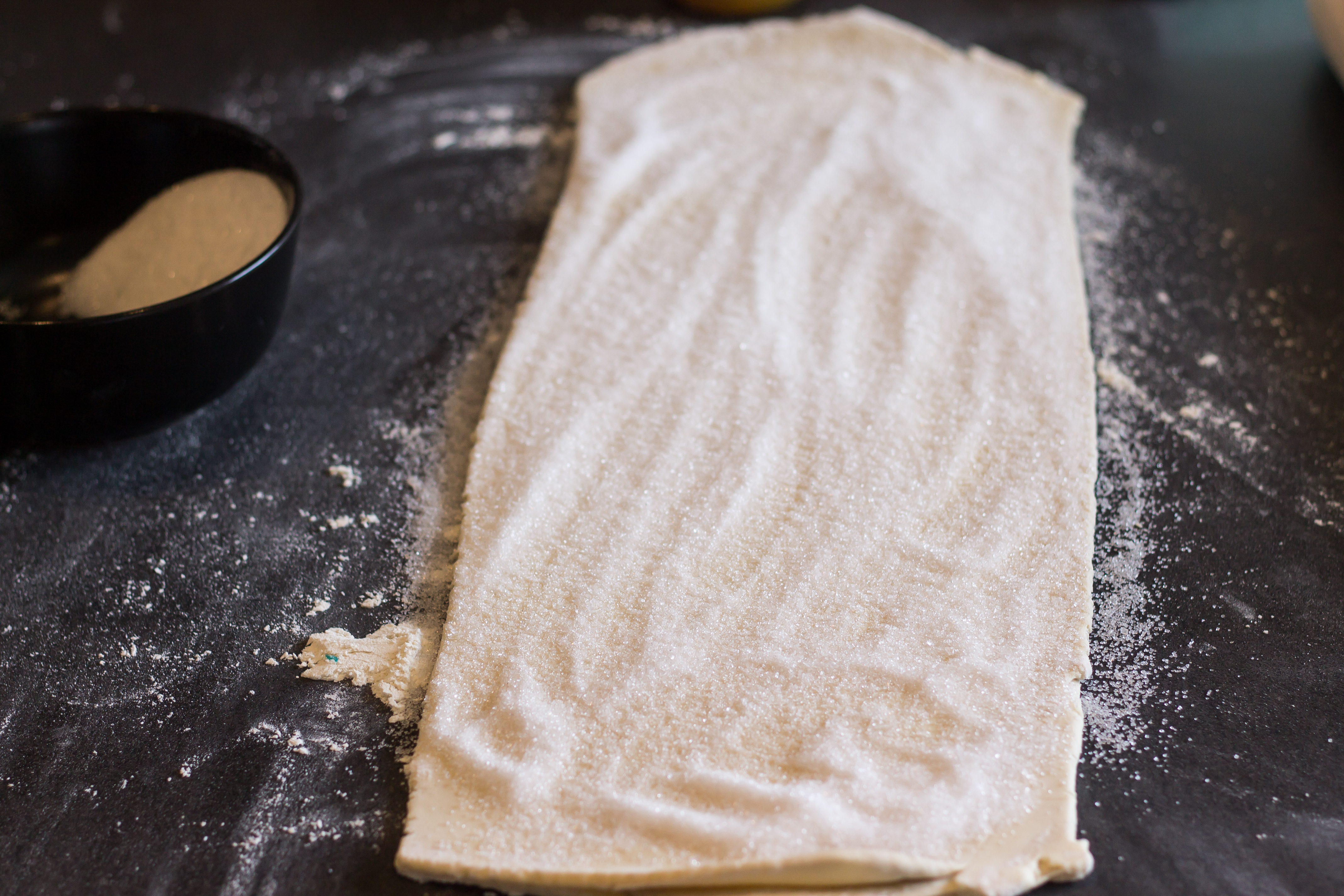 Etape 6 : Saupoudrer de la moitié du sucre et replier en 3.