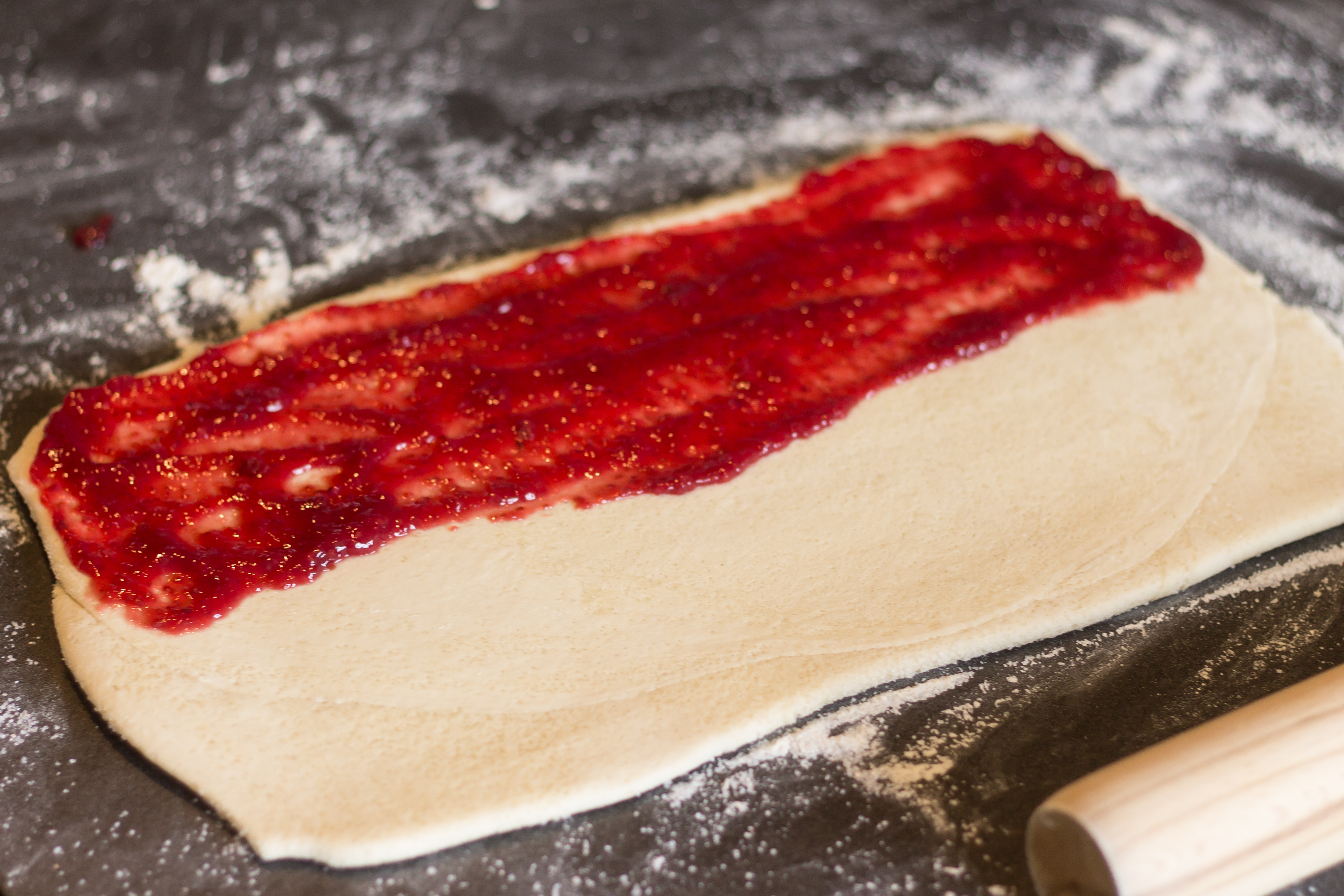Etape 7 : Sur la moitié de la pâte badigeonner de confiture