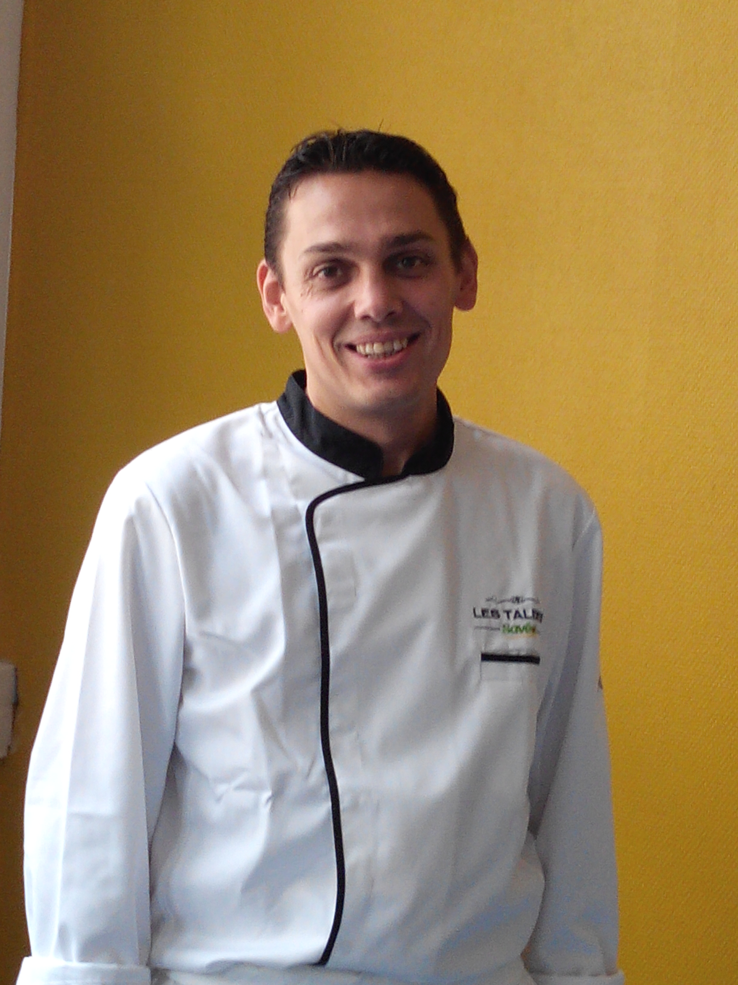 11h00 : Alors que les filles sont déjà à l’oeuvre, c’est à nous les mecs de se mettre en route pour l’atelier de cuisine du grand Monsieur Marx. Lorsque l’on arrive on découvre les filles au travail et on nous donne notre superbe tenue qu’on pourra garder. Un énième cadeau d’environ 150 €. On a vraiment l’air beau dans ces tenues de professionnels. L’organisation toujours aussi impeccable nous annonce que l’on ne devrait pas trainer à démarrer. Tant mieux j’ai hâte de relâcher toute cette pression qui commence à s’accumuler sur mes épaules, d’ailleurs ça se voit que je suis crispé sur la photo avant le démarrage. Lors de mon 1er concours en live j’avais été très à l’aise lors de l’épreuve surement parce que j’avais déjà réalisé les recettes qu’on me demandait. Le délai était de 15 minutes pour préparer une assiette. Ici il faudra en confectionner 5 en 1 heure en totale improvisation.