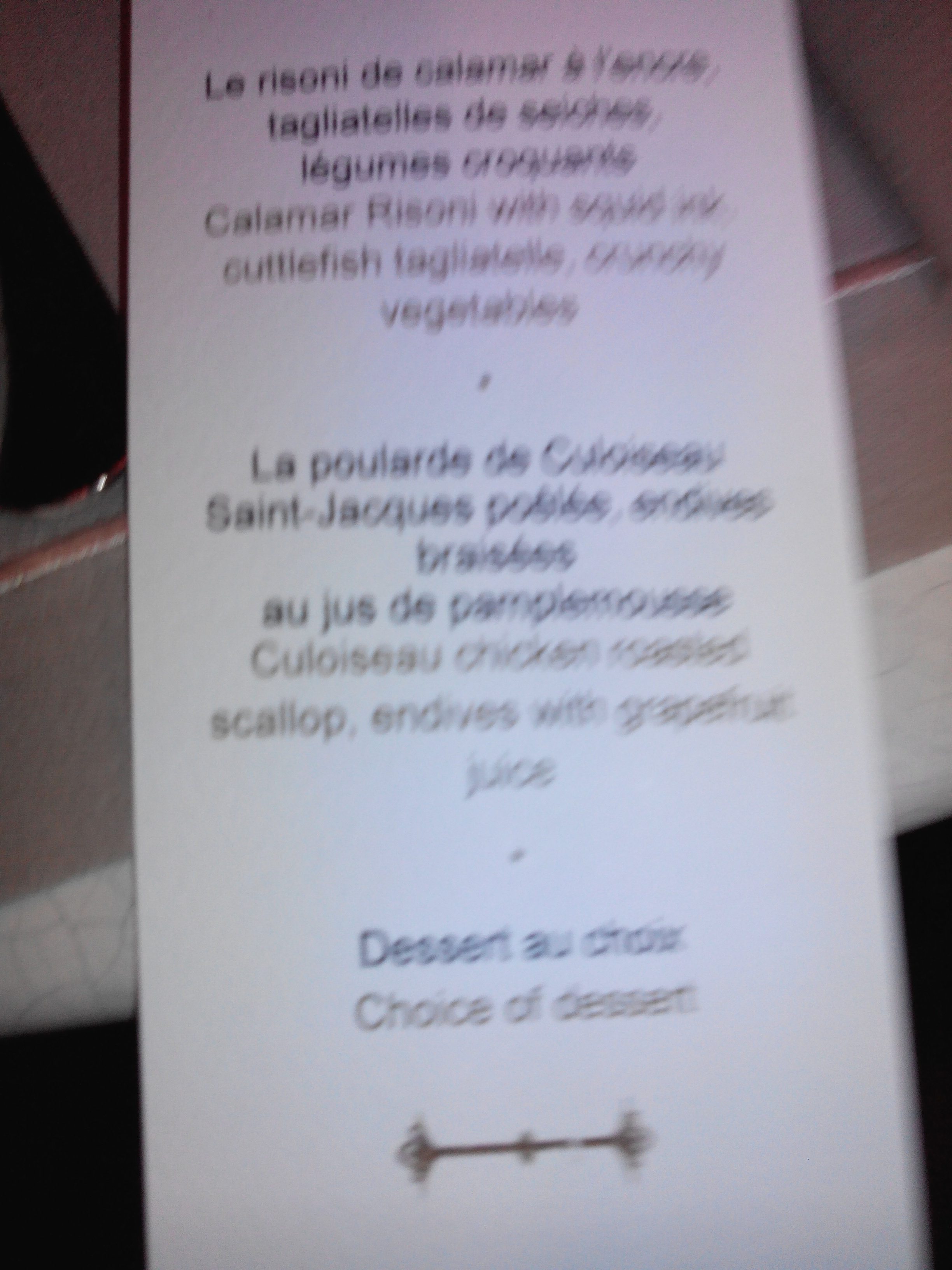 Quand j’énonce le mot « savéol », je vois les yeux d’aurélie s’illuminer et s’orienter vers moi et tout était dit, je me suis sentie comme jonathan smith dans les routes du paradis. J’étais à ces yeux un ange envoyé sur terre par dieu pour la sortir de cette terrible embuscade qui consistait à se transporter de 3 stations sur la ligne 3 pour arriver au restaurant de thierry Marx. Du coup je fais encore le mec sûr de soi, je lui dis « tu » (oui car pour faire le mec sûr de soi il faut tutoyer les gens) , tu participes aussi au concours ? t’inquiètes moi aussi et on part ensemble si tu veux. Rdv à 19h00 en bas.