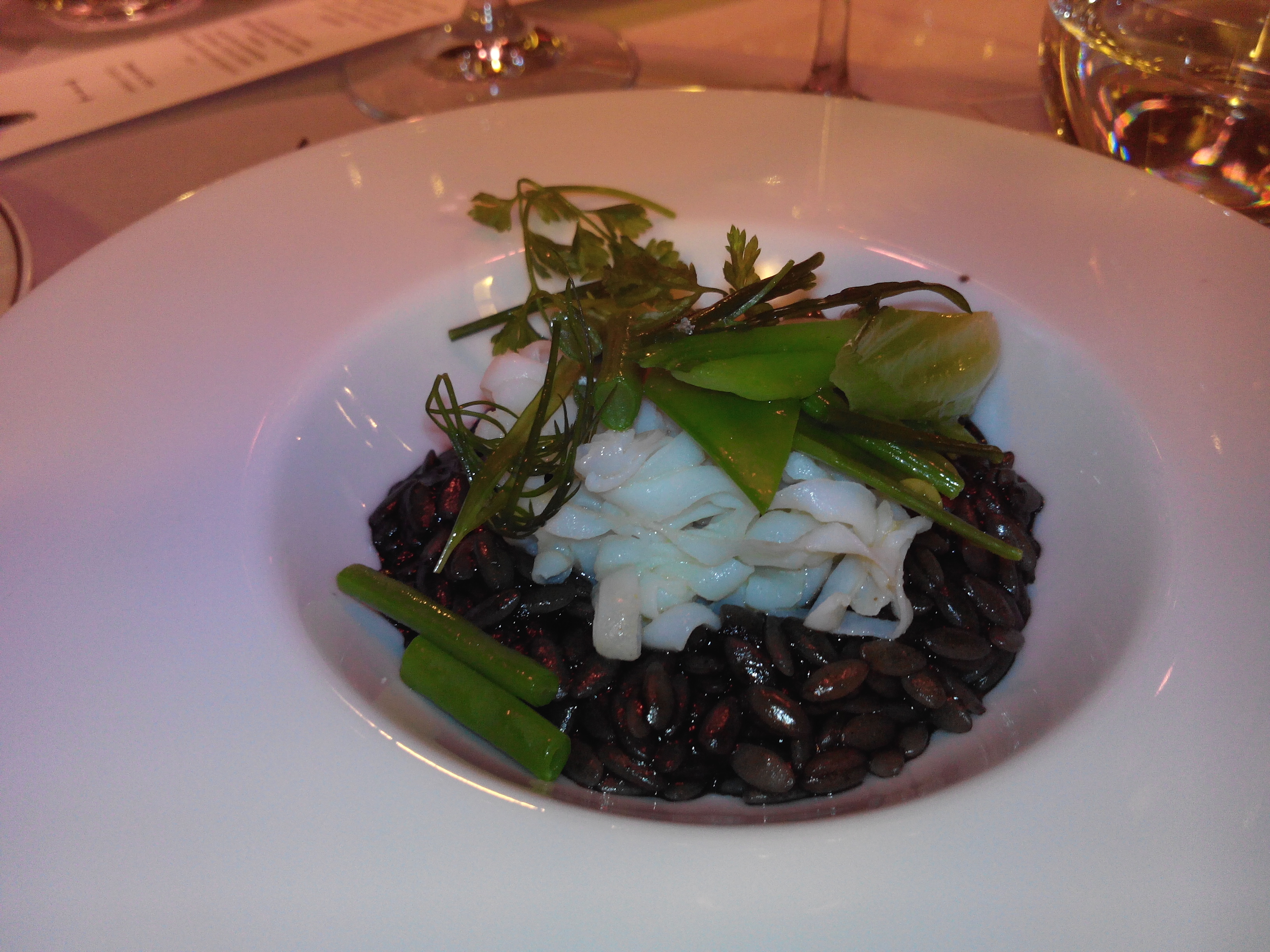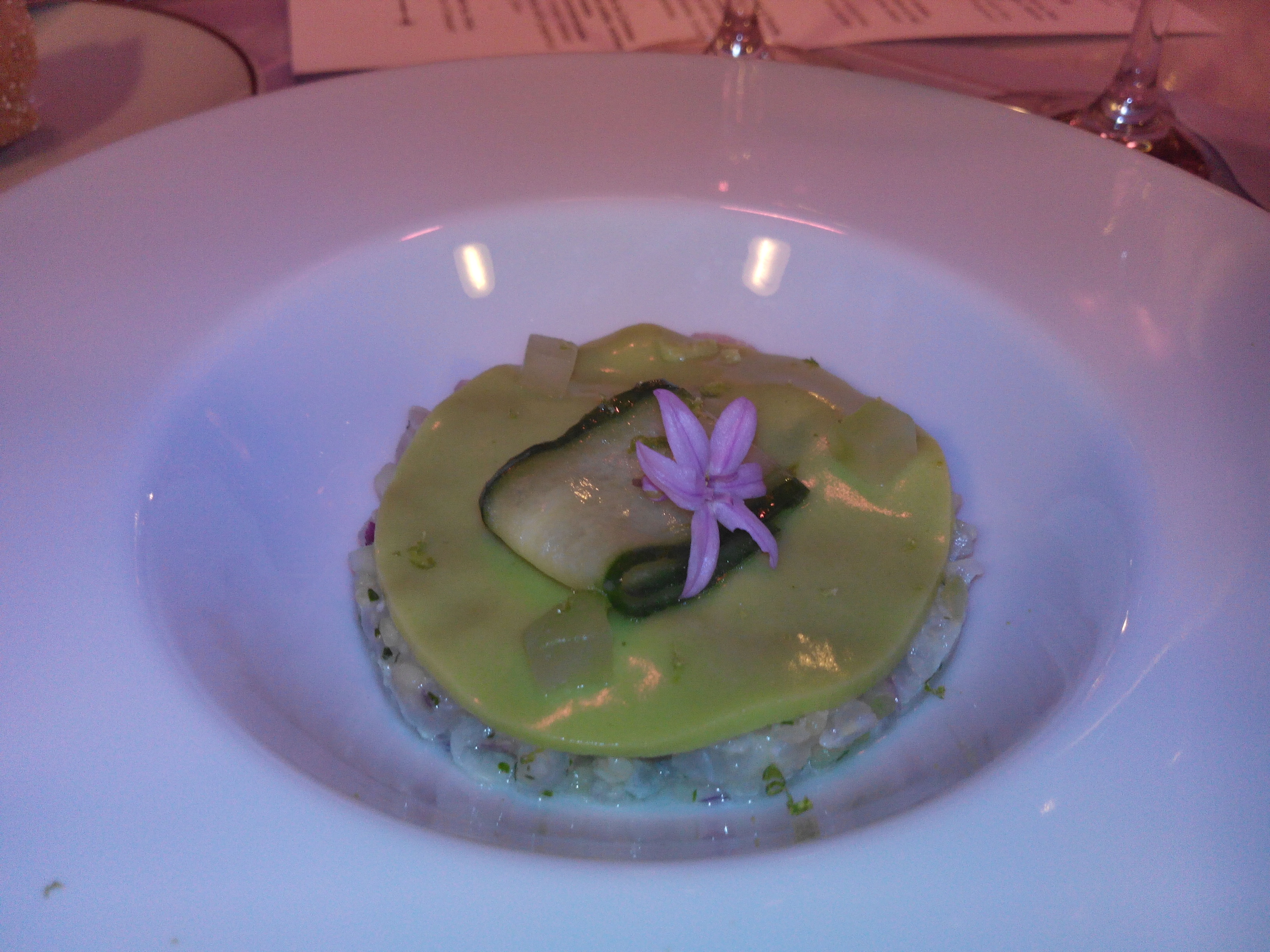 Ensuite arrive rapidement les autres candidats Guilhem et Ludovic et les 2 organisatrices Anne lise et Cécile, Le courant passe super bien dans la soirée, tout le monde se tutoie, plaisante et profite pleinement de cet instant magique. Forcement on parle un peu beaucoup cuisine. Je demande à Cécile si ça ne l’a fais pas trop chier d’être à un repas de geek. On dirait un repas entre informaticiens parlant du dernier Windows. Elle me répond qu’elle préfère largement parler cuisine qu’informatique et qu’elle passe également un agréable moment. Soudain un étrange silence glacial s’installe, je lève la tête pour voir si ça n’était pas une de mes vannes pourries qui était mal passée. Non c’est juste que thierry marx se tenait la devant nous à la table pour venir prendre des nouvelles et il existe peu de personne qui sans parler impose le silence et le respect. Il en fait parti. Il nous lance quelques banalités qui nous semblent bien plus profondes qu’elles ne le sont et part ensuite saluer d’autres clients. Bon bien là christophe, ne la ramène pas et c’est bien assez rare pour le souligner.