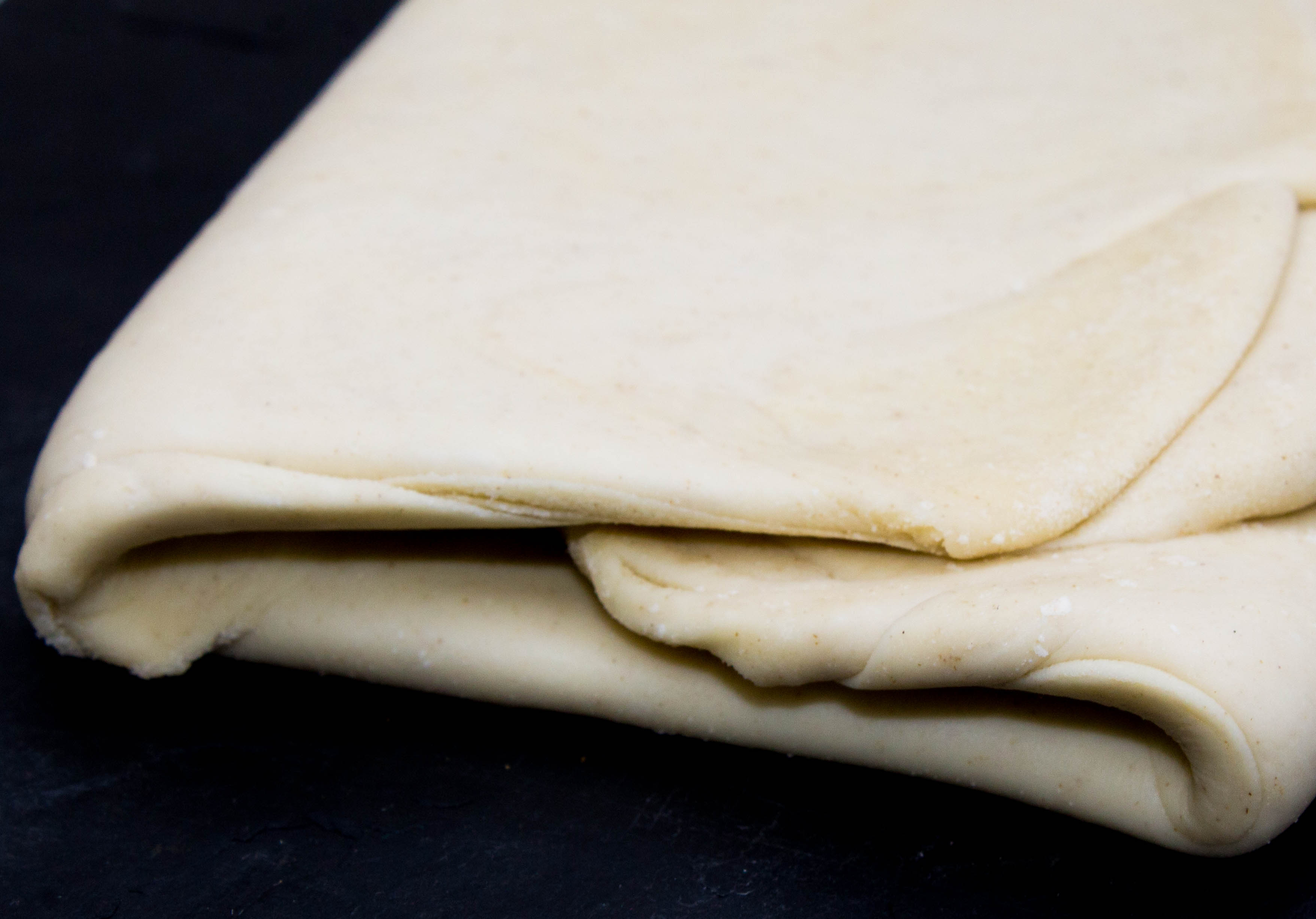 Plier-la pâte en trois en superposant le haut et le bas. Faire 1 quart de tour à la pâte et étaler à nouveau le carré en un rectangle de 10*30 cm.