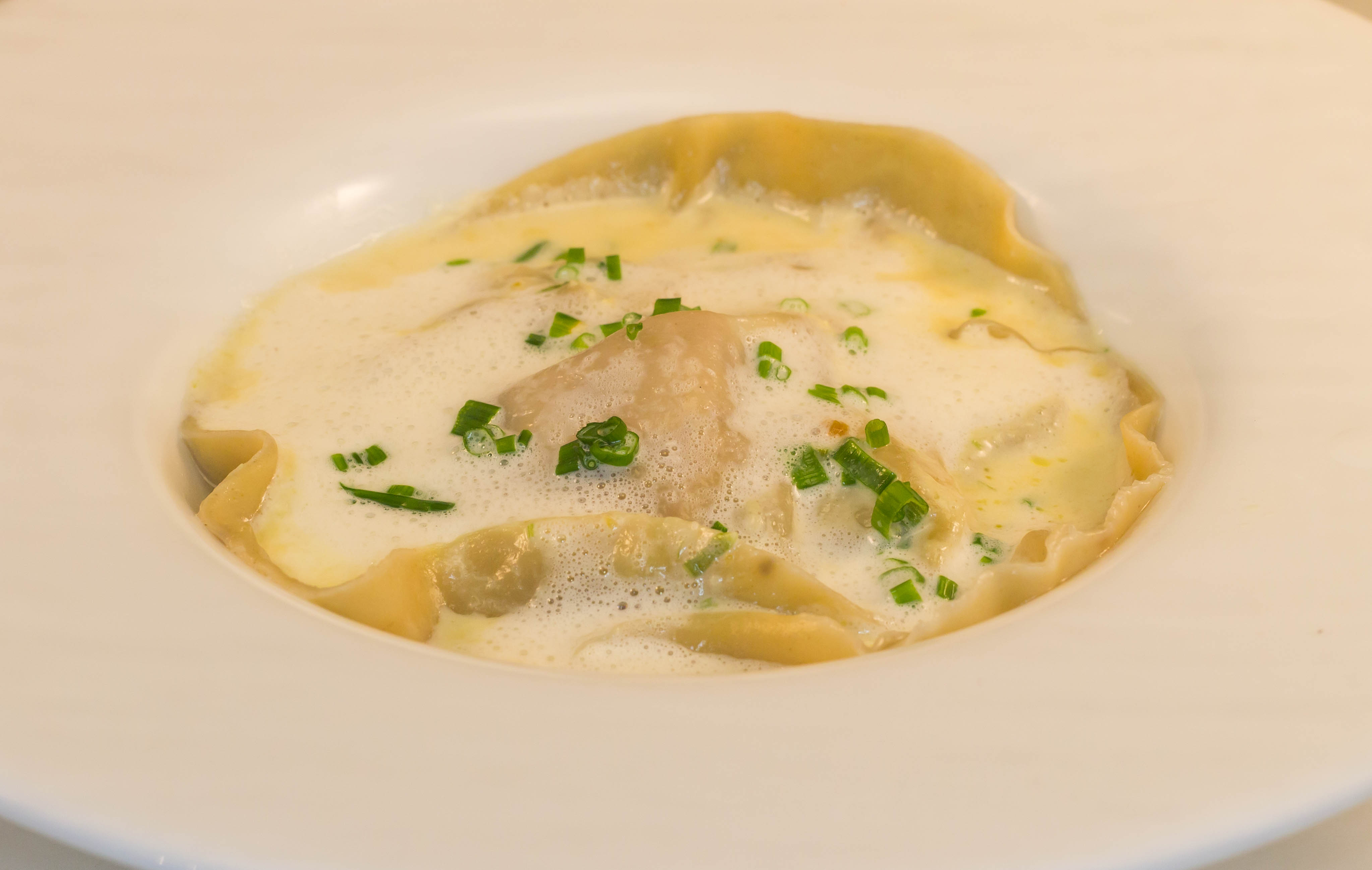 Ravioles de foie gras au bouillon de volaille crémé et à la ciboulette