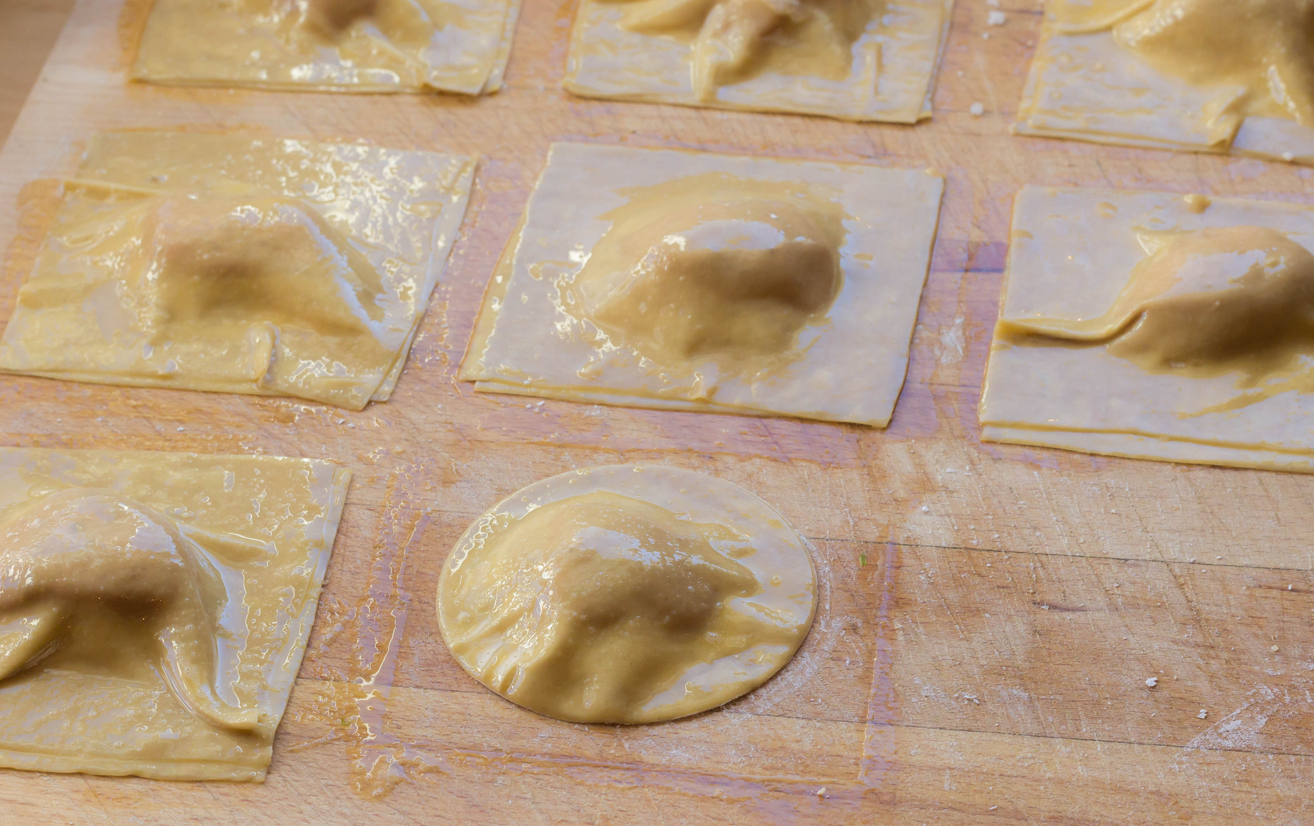 Disposer une feuille au dessus et avec un emporte pièce rond, découper le raviole en cercle.