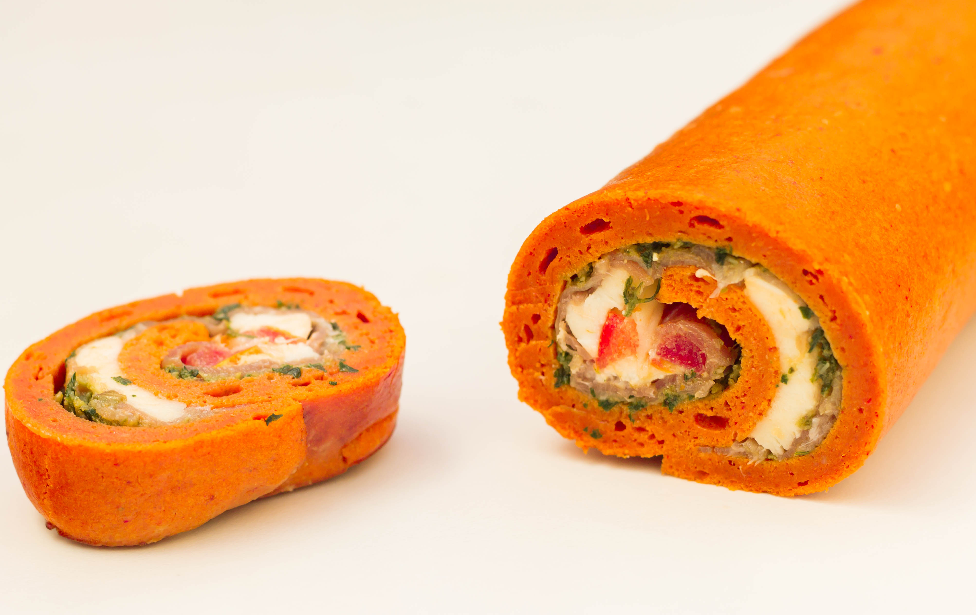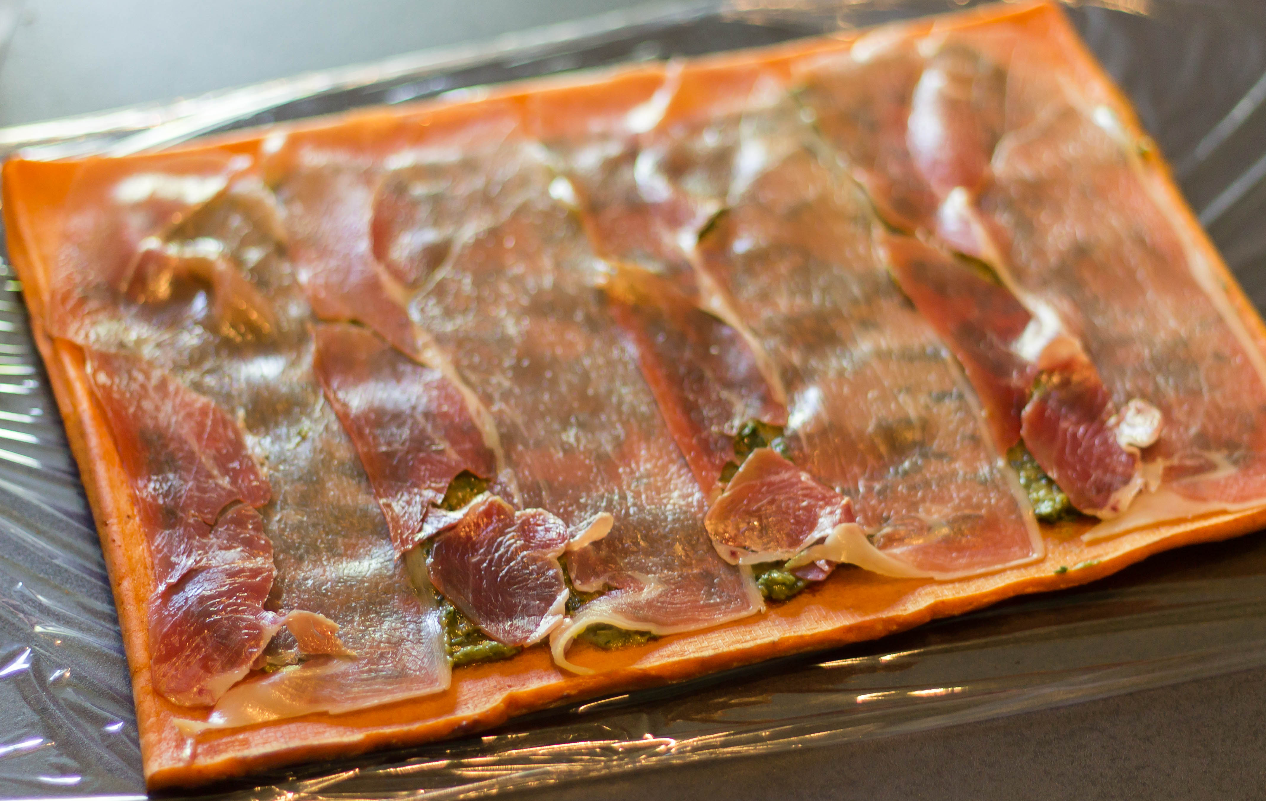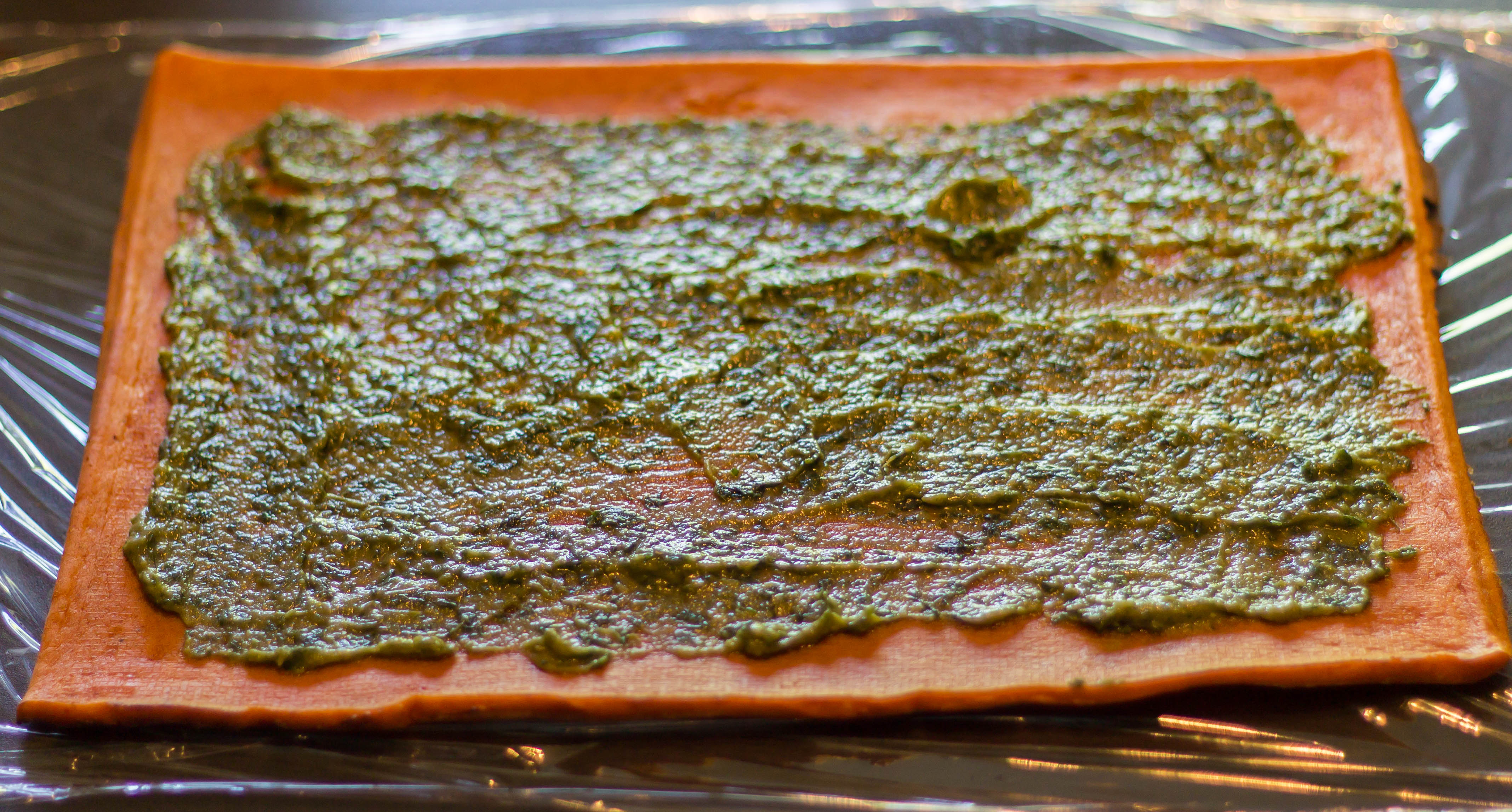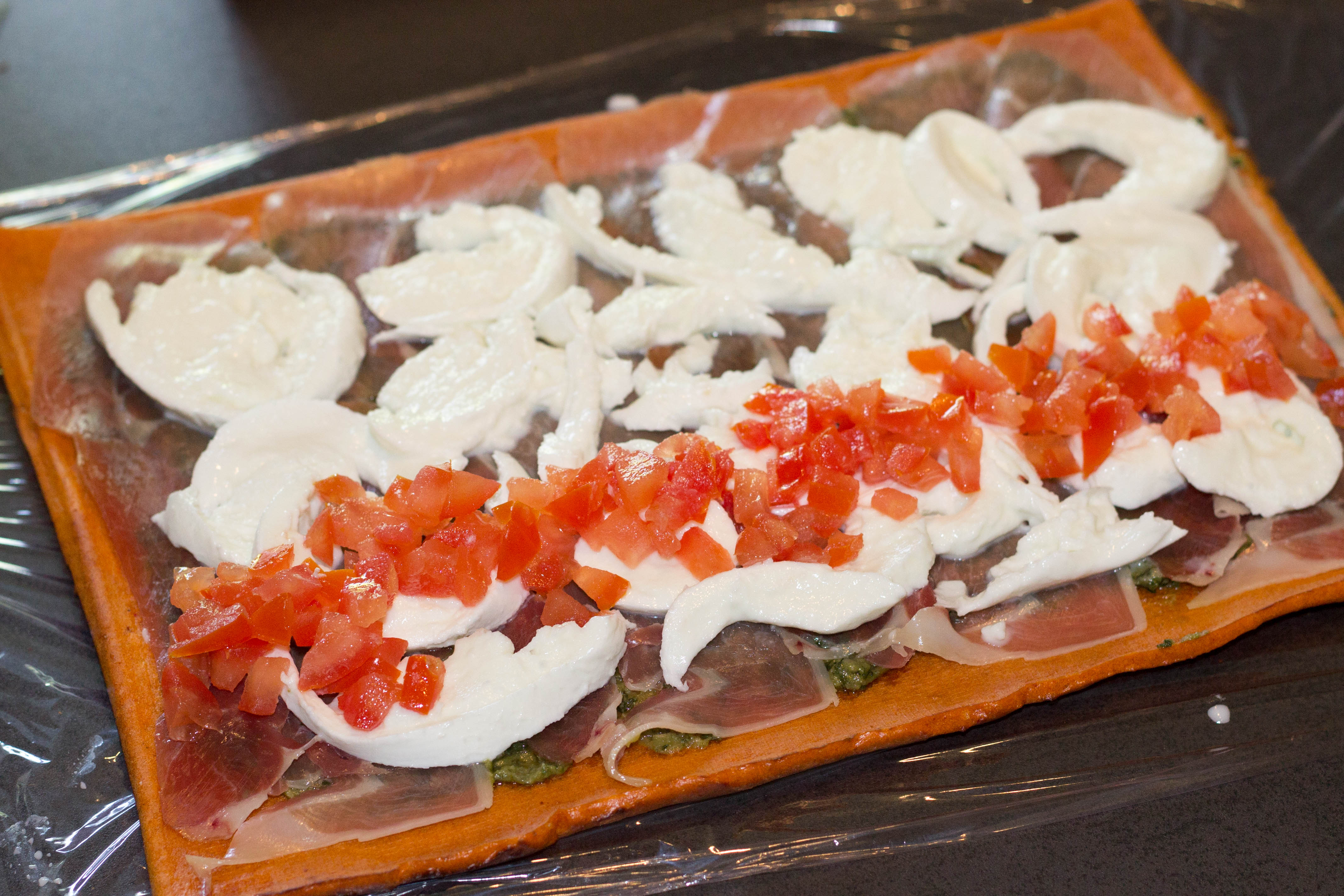 Enfin aidez vous du cellophane pour rouler la génoise sur elle même en commençant par le coté ou vous avez poser la tomate. Bien serrer en roulant et ajouter du cellophane autour.
