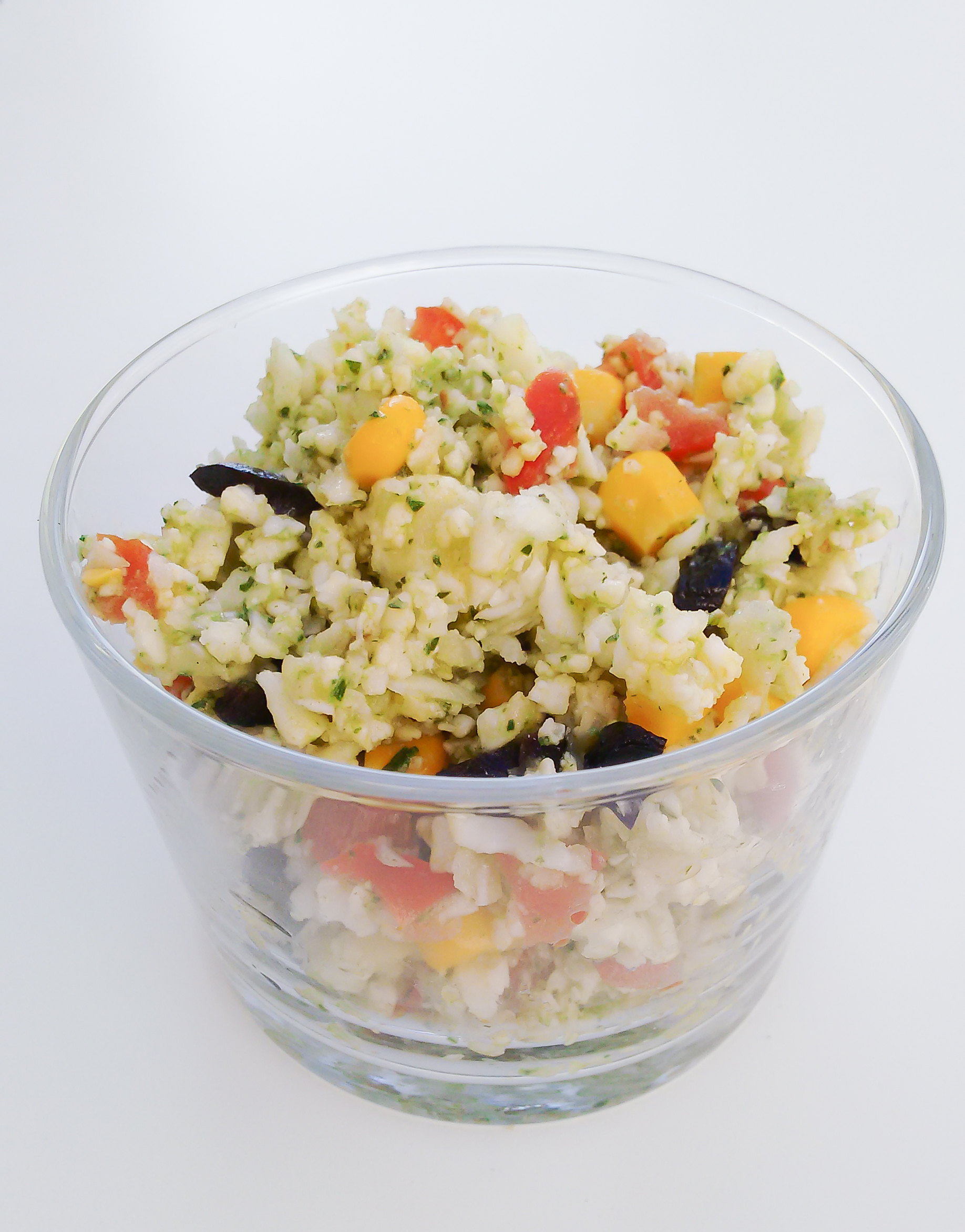 La cuisine, c’est comme dans un couple, il faut savoir innover, surprendre au risque de susciter l’ennui. Certes je ne suis en aucun cas un expert dans le conseil en vie conjugale mais pour parler taboulé, ça c’est mon dada (alors suivez moi dans BILTO)… Holà je m’égare là, trop regardé la télé dans mon enfance. Bref où j’en étais ? Ah oui je voulais juste vous dire qu’un taboulé pouvait être préparé sans semoule pour plaire aux allergiques au gluten où même pour changer tout simplement. Le choux fleur c’est la base après j’ai pris tout ce qui restait dans mon frigo et dans mes placards et je l’ai mis dedans…