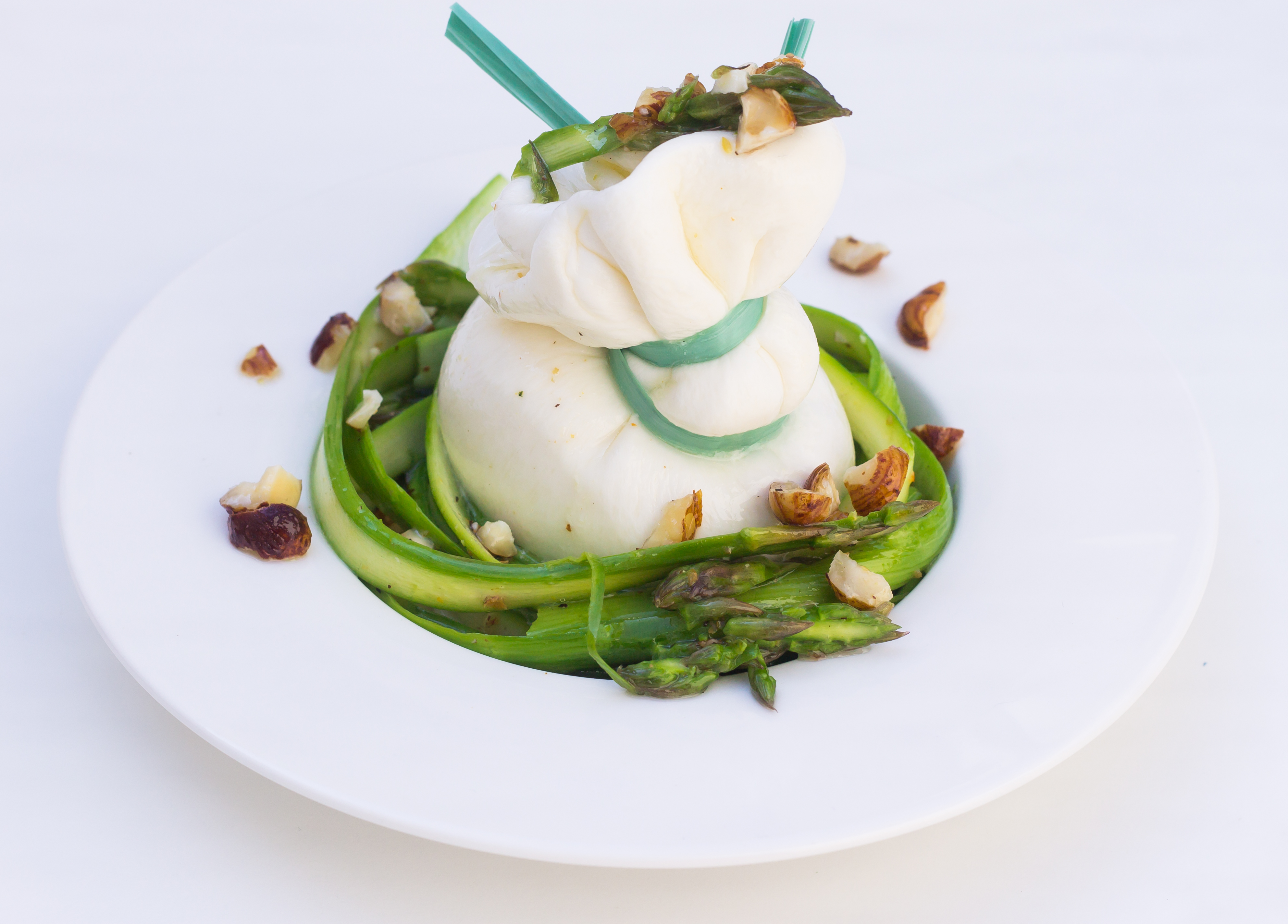 Déposer les asperges en nid sur une petite assiette et déposer la burrata dessus.