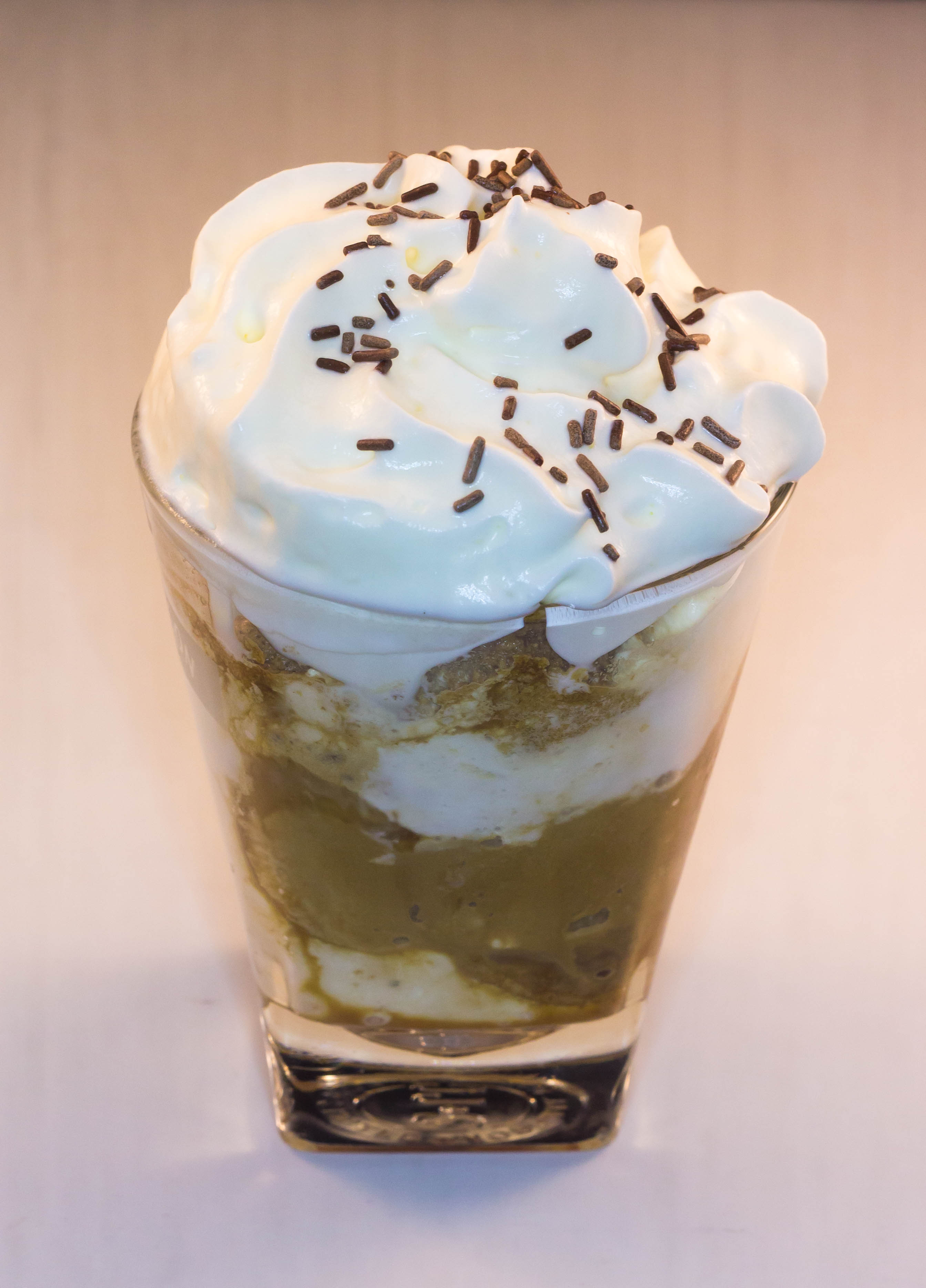 Terminer par la crème chantilly et avant de servir verser sur le dessus un peu de mélange café.