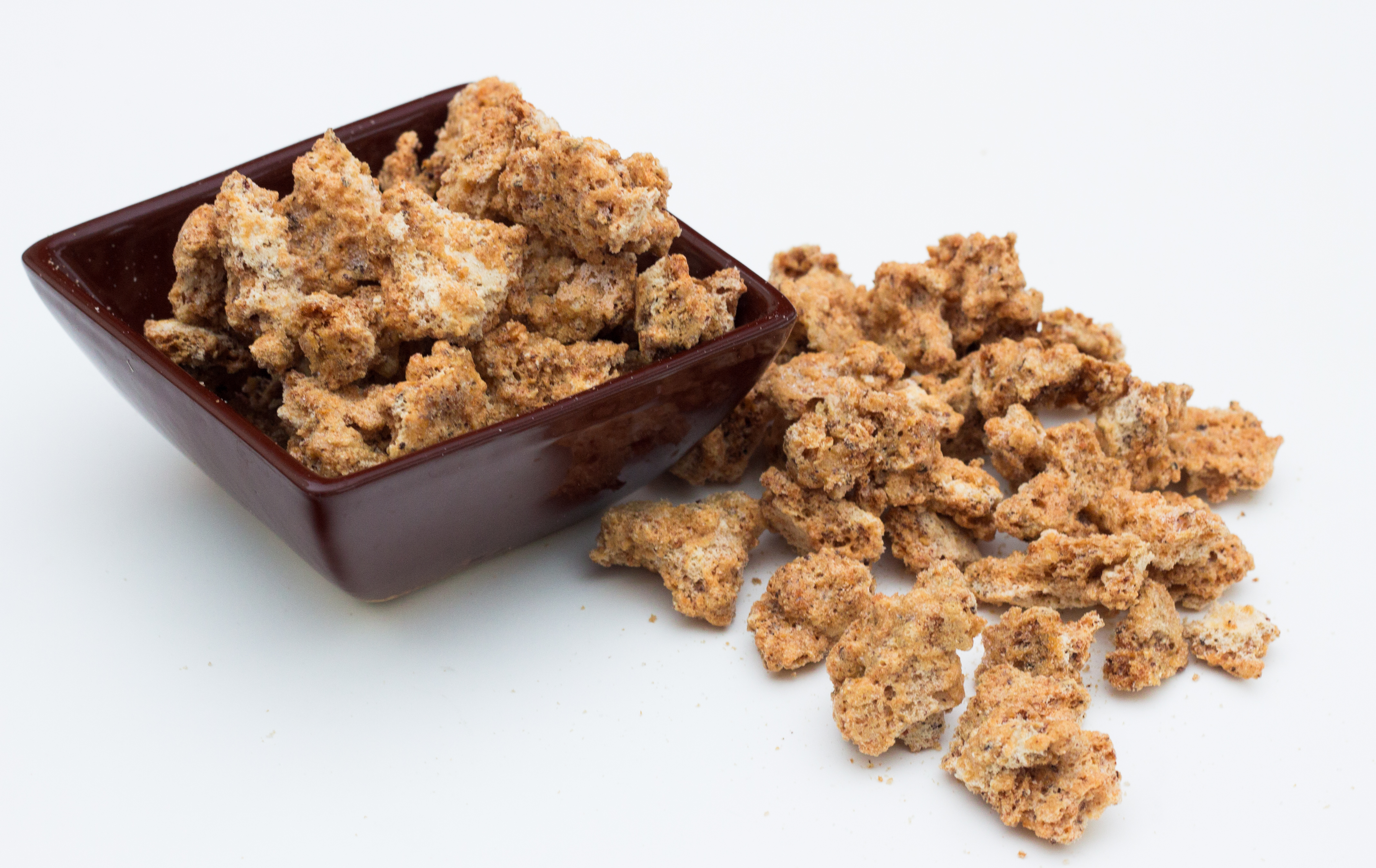 Casser le biscuit en petites pépites. Les placer dans un grand bol et ajouter les 70 g de blanc d’œufs pour enduire l’ensemble en mélangeant délicatement.