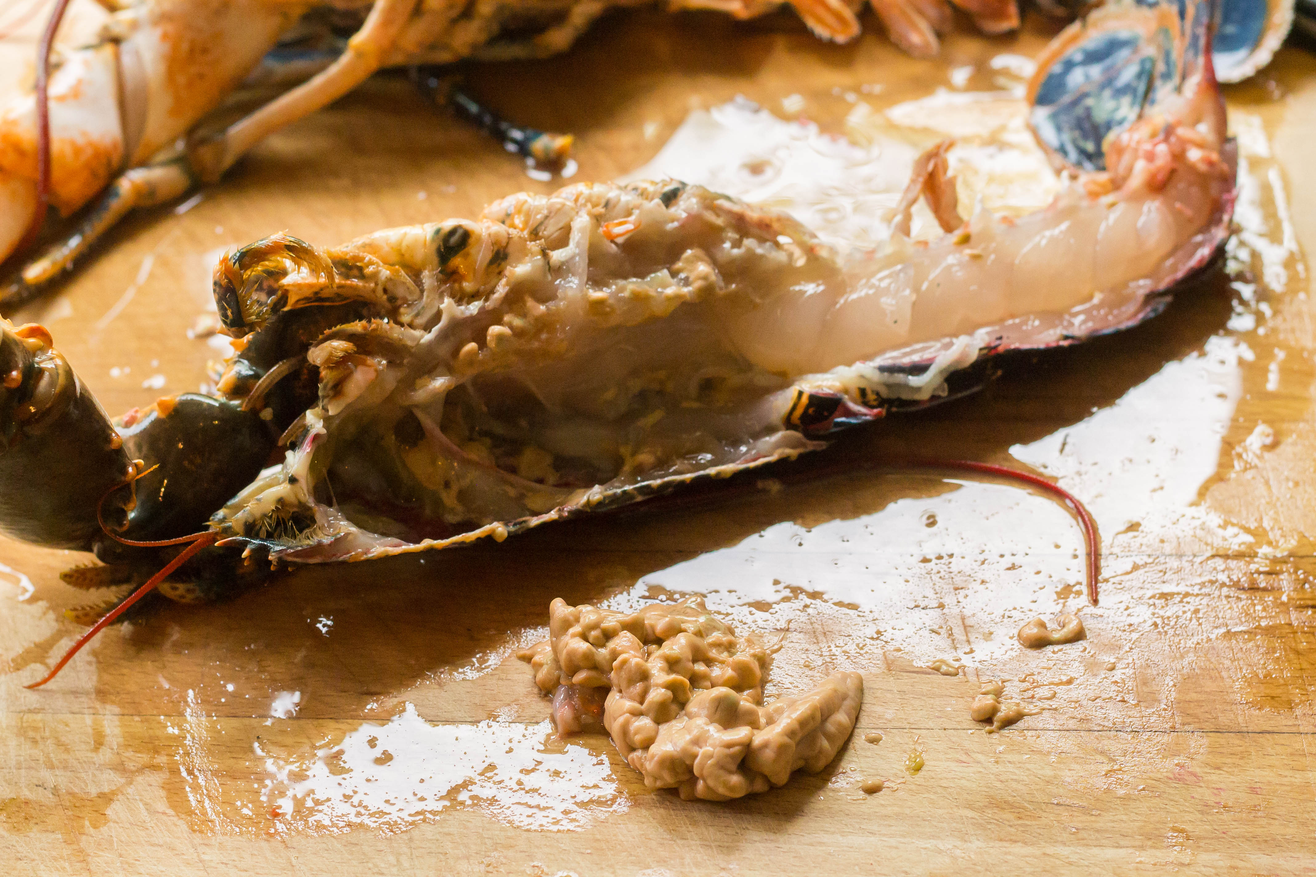 Retirer la poche à gravier qui se situe entre la tête et la queue (ce qui laisse ce grand vide dans la carcasse du homard ). Si vous souhaitez faire la sauce au corail retirer également le corail des homards (Petite poche vert foncé qu’on ne voit malheureusement pas sur cette photo).