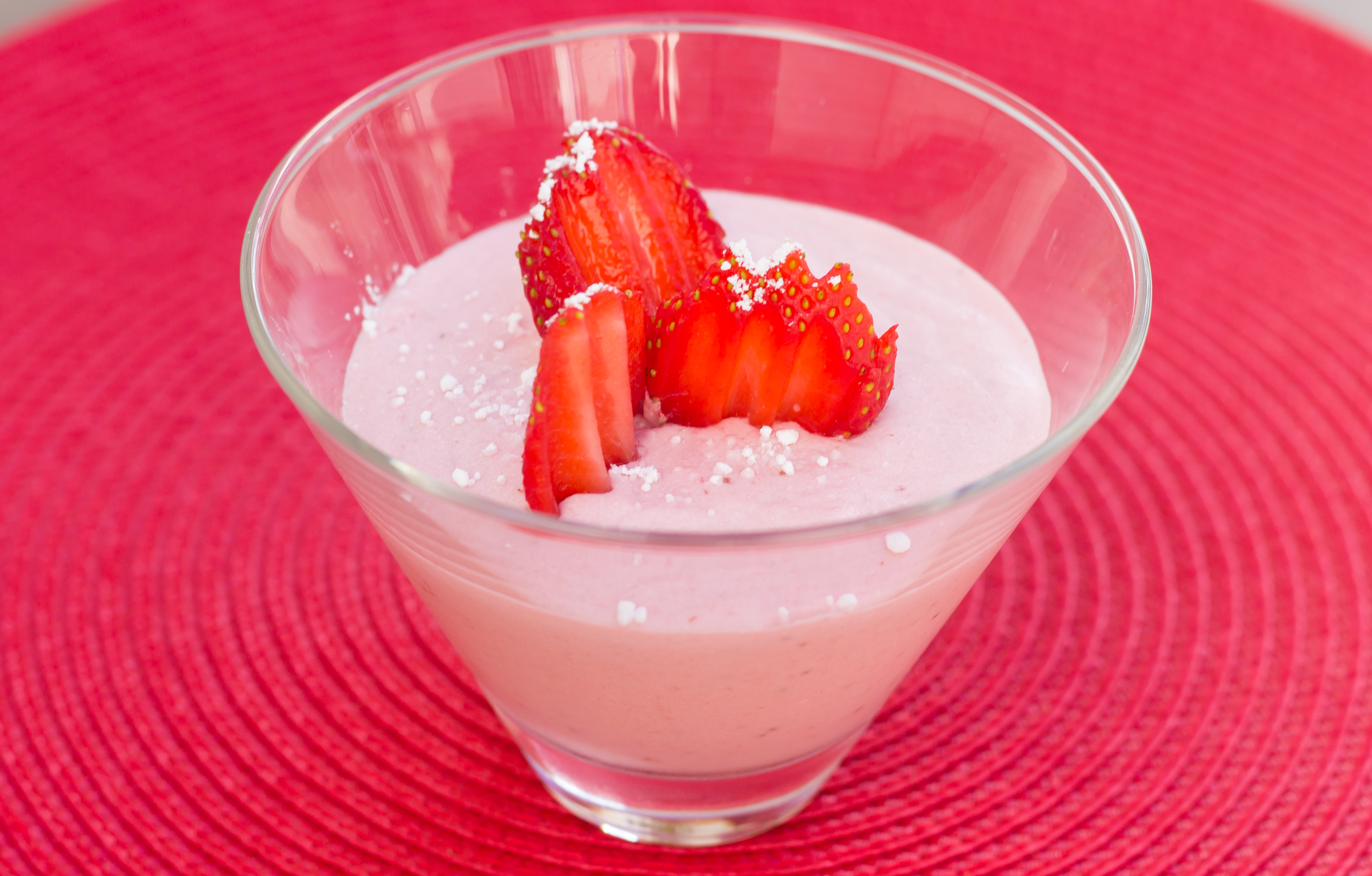 Laver et équeuter les fraises. En garder 4 et mixer le reste avec le sucre.