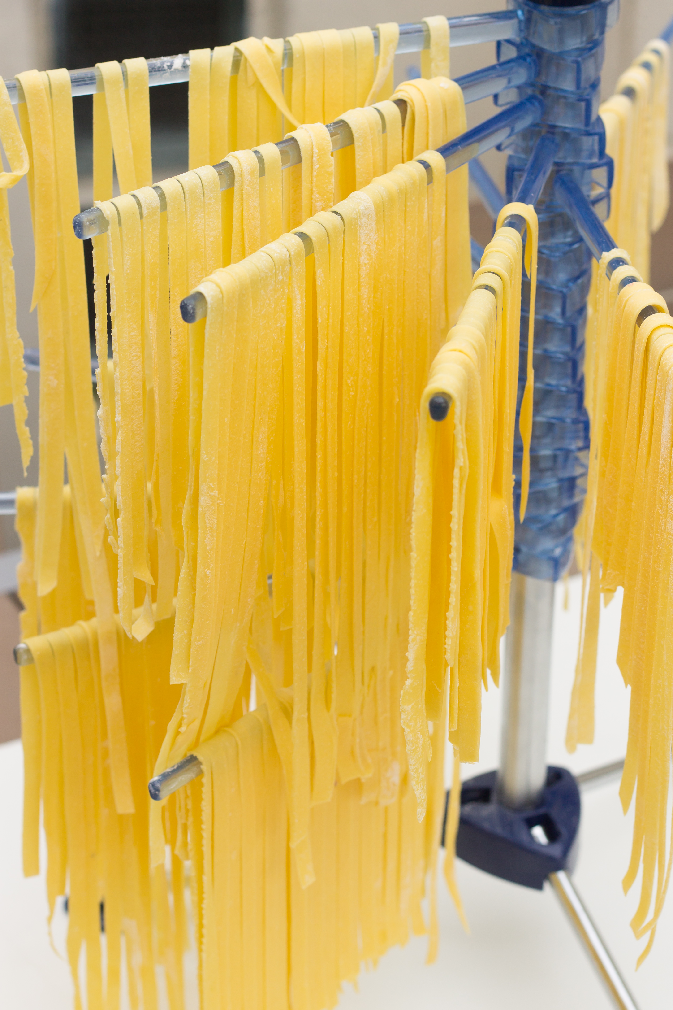 Pour les pâtes, les passer au laminoir qui découpe à la forme souhaitée et les poser sur un plan de travail fariné si vous souhaitez les cuire de suite ou les étendre sur un séchoir comme ci dessous pour une utilisation décalée dans le temps (éviter qu’elles soient en contact et qu’elles se collent entre elles).