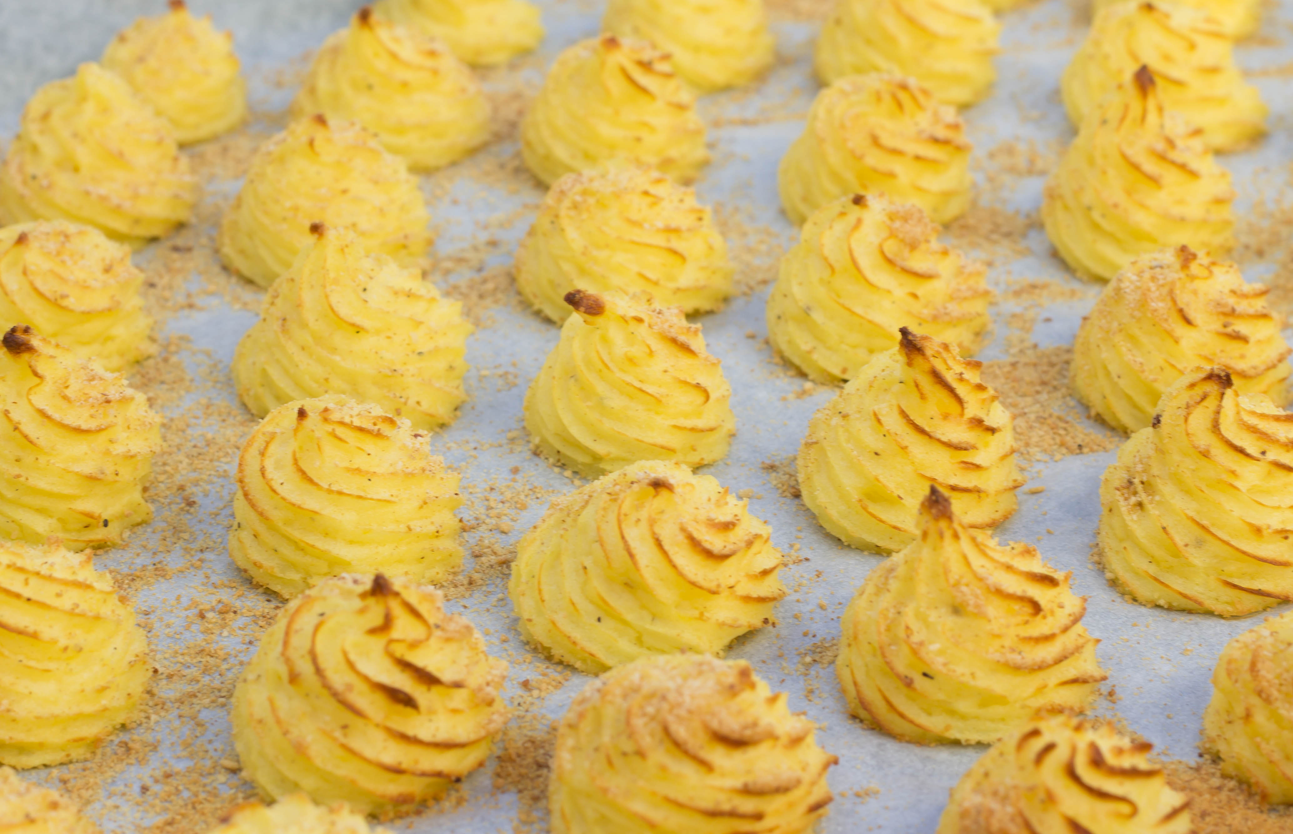 Remplir une poche à douille cannellée de purée et confectionner des rosaces sur une plaque recouverte de papier sulfurisé. Saupoudrer de chapelure.