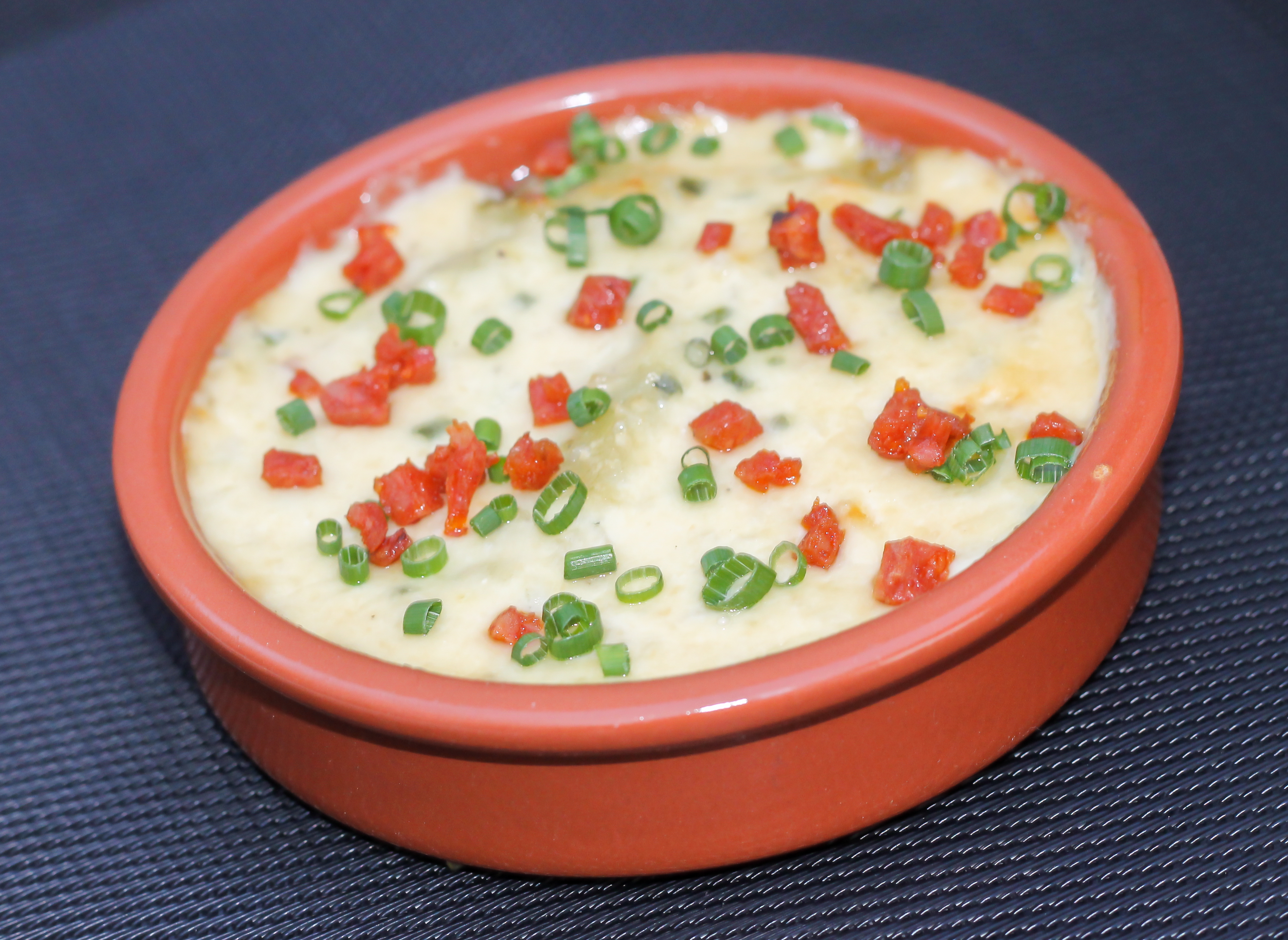 A la sortie du four, déposer quelques cubes de chorizo et quelques tronçons de ciboulette sur le dessus.