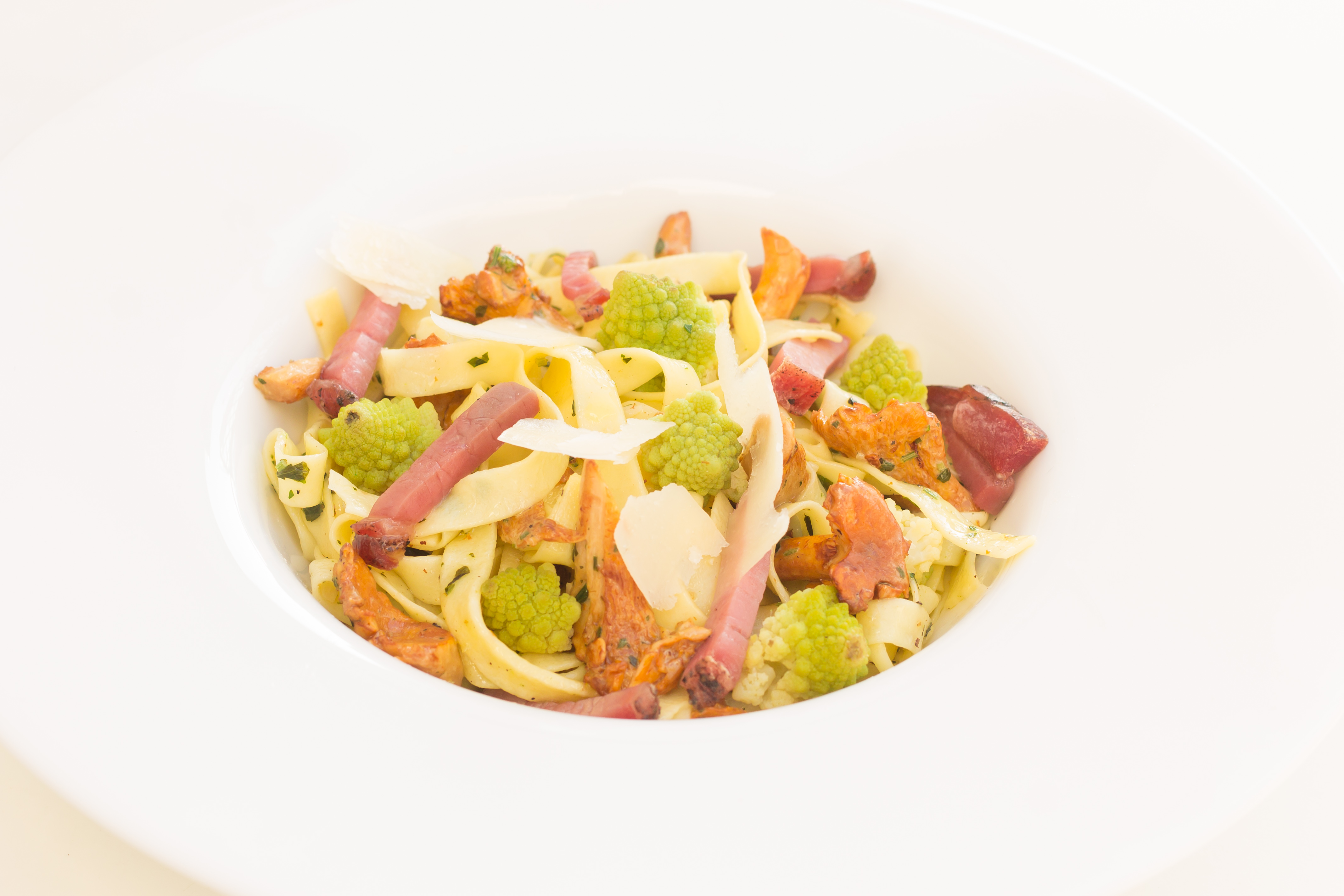 Y’a quoi dans mon frigo : Aujourd’hui il me reste 1 petit choux romanesco, des girolles, de la coppa que j’avais acheté en Italie et du parmesan. J’ai presque toujours du parmesan dans mon frigo. Ca reste un ingrédient idéal à la base de beaucoup de préparations. (sauces, quiches, salades, etc…). Et comme il n’y a rien de meilleur qu’un bon plat de pâtes, c’est parti pour un plat aussi beau que bon.